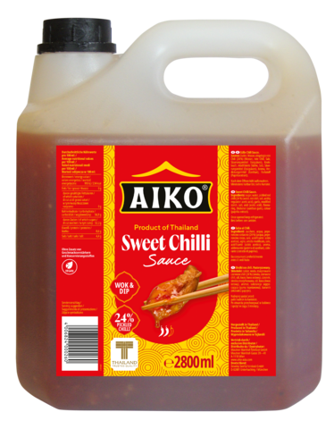 Die AIKO® Sweet Chilli Sauce im 2,8 Liter Kanister besticht durch ihr unverkennbar fruchtig-würziges Aroma. Der Chilli Anteil von 24 % sorgt dabei für die angenehme markante Schärfe, die durch eine leicht süßliche Noten abgerundet und gemildert wird. Die Sweet Chilli Sauce ist auch in der 730 ml Glasflasche erhältlich.